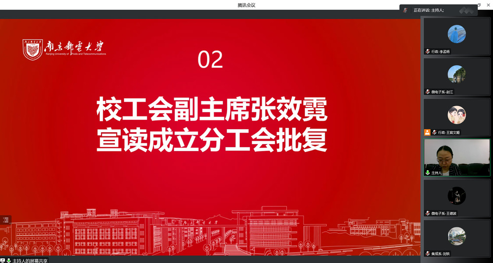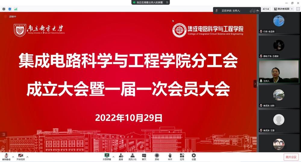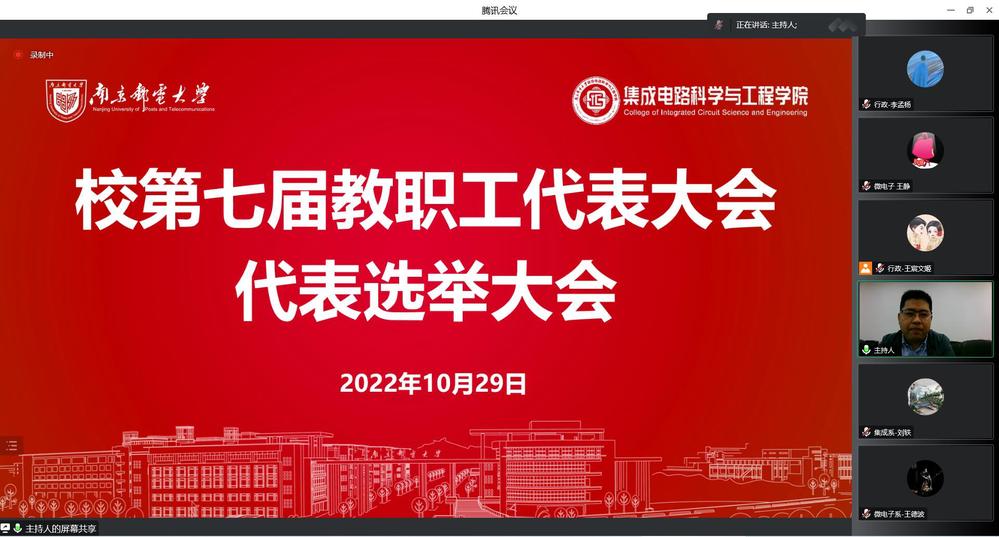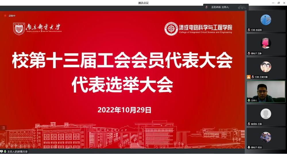 10月29日,集成电路科学与工程幸运轮盘 通过线上形式成功召开分工会成立大会暨一届一次会员大会,校第七届教职工代表大会代表和校第十三届工会会员代表大会代表选举大会。校工会副主席张效霓出席,幸运轮盘 全体教师参加本次会议,大会由院党委书记高翔和院党委副书记乔祖琴分别主持。