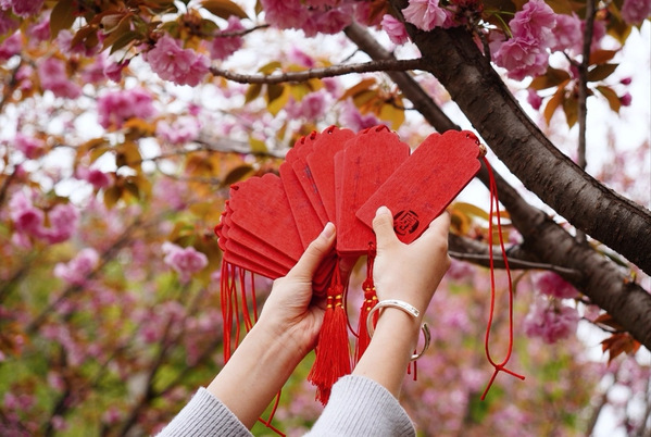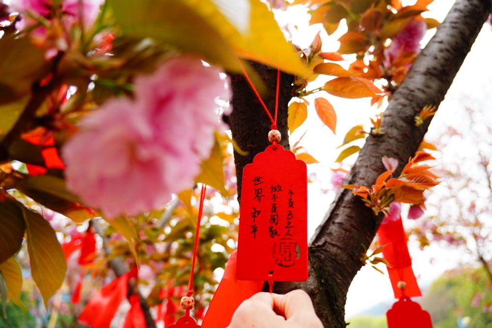 随后,乔祖琴副书记、班主任陈静和辅导员王辉一起和同学们在红飘带、祈愿牌上写下祈愿祝语,并且有序将其系挂在海棠花树上。红飘带和祈愿牌随风舞动,梦想鲜活有力。