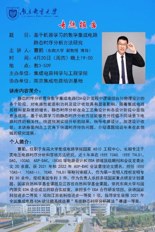 2023年4月20晚上,东南大学曹鹏教授来幸运轮盘做“基于机器学习的数字集成电路静态时序分析方法研究”专题报告,报告由集成电路科学与工程幸运轮盘