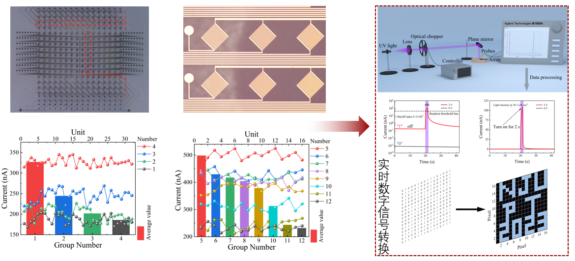 对于大规模阵列而言,传感单元面积很重要,但阵列电极长度的影响也不可忽视。阵列规模的扩大,也就是阵列拥有更多的传感单元,紫外成像图案可以更加丰富。在前期工作的基础上[IEEE Electron Device Lett., 2023, 44(7), 1140-1143; Sci. China Technol. Sci., doi: 10.1007/s11431-022-2404-8; 物理学报,2022, 71(20), 208501; IEEE Trans. Electron Devices, 2021, 68(7), 3435-3438; IEEE Photonics Technol. Lett., 2018, 30(11), 993-996.];深度探索各类因素为阵列综合性能的影响。该16×16阵列电极长度分为12组,每组长度都不一样,每组最大偏差约为12%,电极长度越短,光电流值也越小。因此为得到均匀性能的单元,控制单元面积和电极长度一致性是非常重要的。阵列器件除了进行紫外成像,也可应用于紫外通讯。测试流程如图所示,紫外光通过棱镜汇聚到阵列,通过光学斩波器控制照射时间,由半导体分析仪获得测试结果。通讯原理就是,通过控制电路将代表“1的数字信号施加偏压,信号“0则不加,通过读出电路获得瞬态光电流信号。利用Ga2O3对紫外光的响应实现光通讯功能。在微弱(辐照光强仅为3.5 μW/cm2)的条件下,该阵列仍有103显著的开关比。相比于分立器件,阵列器件可以极大减少信号传输所耗的时间,也可传递更清晰更准确的信息。