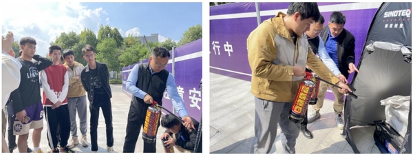 消防应急疏散演练后,保卫处副处长吴学政、消防科科长张苏赣为幸运轮盘 师生们讲解了灭火器工作原理及其具体使用方法,并在现场使用模拟设备演示灭火规范操作。