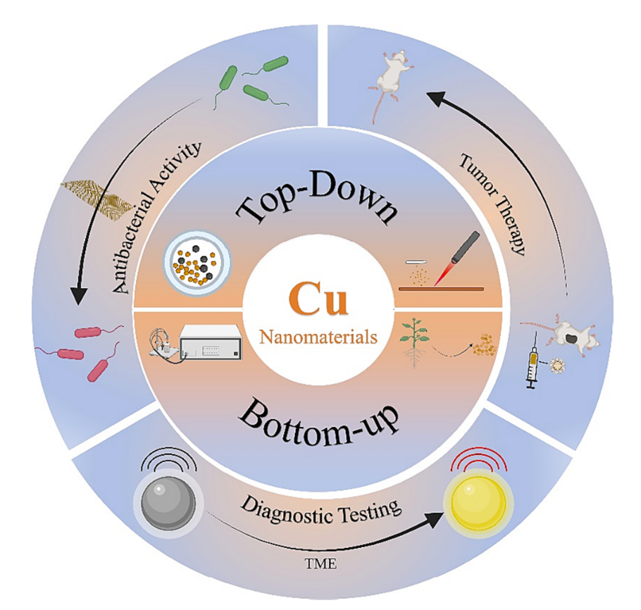 在金属基纳米材料中,铜基纳米材料以其良好的生物相容性和特别的性能成为生物医学领域的研究热点。Cu-基纳米材料已被广泛应用于抗菌、成像和治疗领域,显示出良好的生物医学性能。然而,对铜基纳米材料的系统总结较少,尤其是在铜基纳米纳米材料的合成方面。晏善成教授团队联合鼓楼医院李智洋研究员,发表综述文章《Copper-based nanomaterials for biomedical applications》。论文首先介绍了Cu基纳米材料的分类以及通过自上而下和自下而上两种类型合成的各种方法。然后,对其在抗菌、成像和肿瘤治疗三个领域的应用进行了分类和总结。最后,讨论了Cu基纳米材料的合成和应用所面临的挑战以及未来发展。