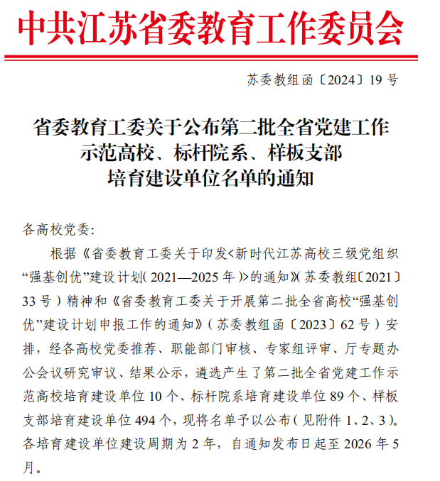 根据《省委教育工委关于公布第二批全省党建工作示范高校、标杆院系、样板支部培育建设单位名单的通知》苏委教组函〔2024〕19号,幸运轮盘 微电子系教工党支部成功入选第二批全省党建工作样板支部培育建设单位。