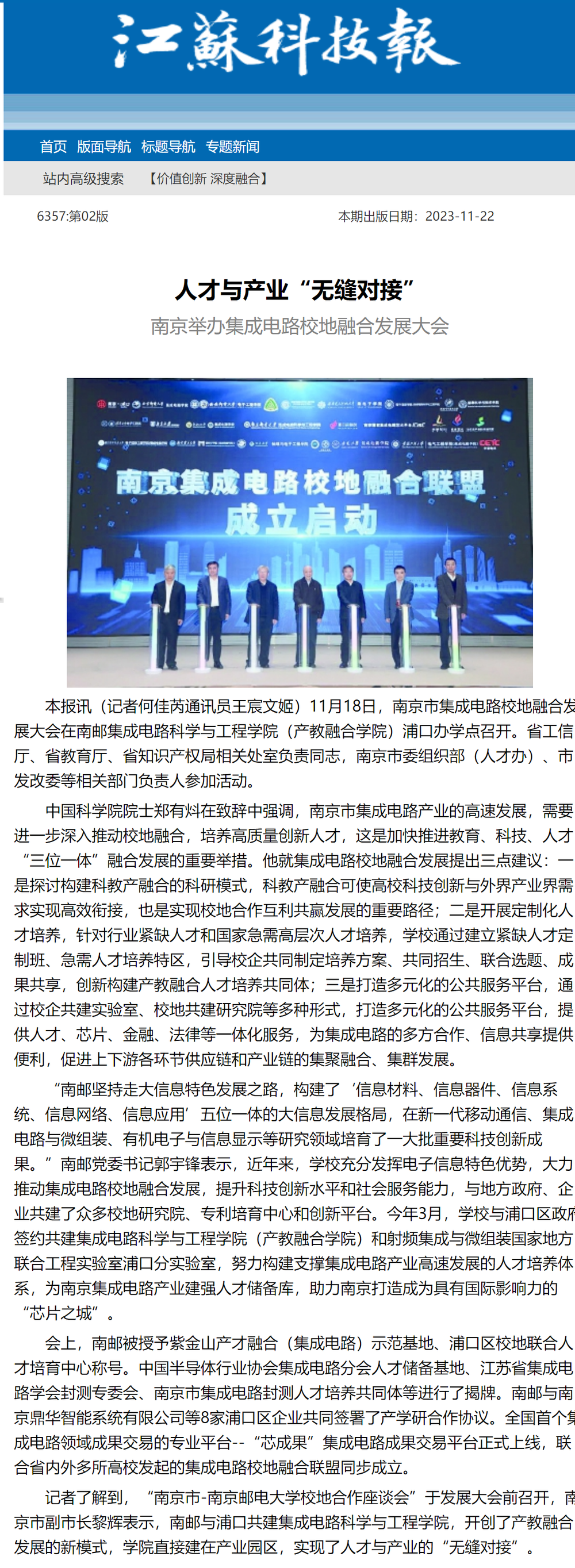 【江苏科技报】人才与产业“无缝对接”南京举办集成电路校地融合发展大会