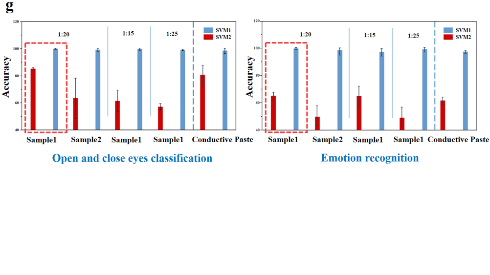 随后利用频带能量比分析和支持向量机算法对采集到的脑电信号进行情感识别。两个SVM算法的识别率分别达到83.5%和99.3%,所制备的ITO水凝胶电极对情感的识别结果为稳定的较高识别准确率。在采集脑电信号前后只需极少的准备工作。利用广泛的原材料和简单的制备方法增强了水凝胶电极的潜在医学应用,从而大大促进了脑电设备的进步和抑郁症相关病理的研究。