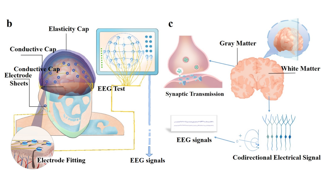 图1 材料制备、测试及其脑电原理示意图