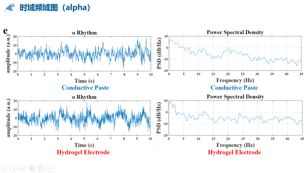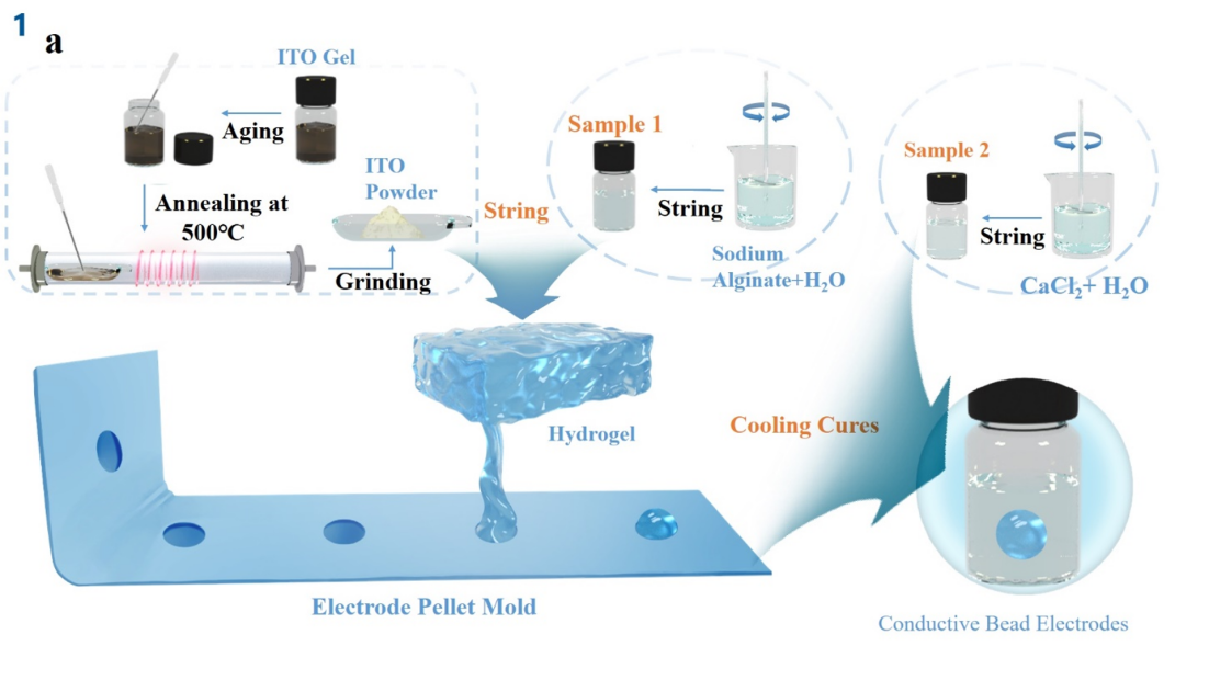 针对上述问题,我们采用ITO前驱液溶胶作为导电性能的原料配方,退火研磨后与海藻酸盐混合在一起,制成了一种无细胞毒性的ITO水凝胶球形电极。电极显著且均一的导电性使其能够产生稳定的自适应变形,符合不同的头皮地形。通过电学测试,大多数电极阻抗值皆降至10 kΩ以下,表明与传统的导电膏相比,水凝胶电极具有较好的电学性能。随后脑电数据采集实验证实了其传导性和信号传输的可靠性。