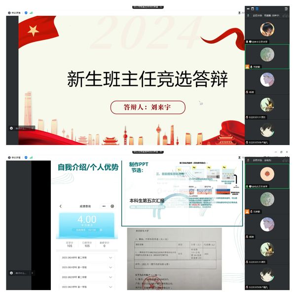 于线上举行2024级新生班主任助理竞选答辩。学院2022级辅导员王辉和2024级新生辅导员范建鹏出席本次答辩并担任评委。本次答辩由范建鹏主持,共有12名同学参与。