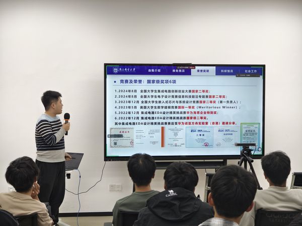 学院2021级微电子科学与工程专业邵天成从个人经历和逐梦前行两个方面就学生干部经验、科创竞赛、保研经历、生涯规划进行了分享。他表示,要平衡学业和社团工作,就要首先管理好自己的学业,在此基础上合理分配参加社团工作的时间。最后,他提醒身体是革命的本钱,学习和活动固然重要,但身体健康才是根本。