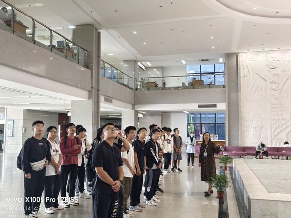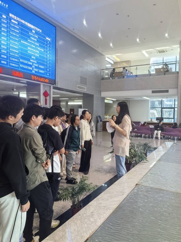 活动现场,新生跟着讲解员依次参观图书馆的各个区域。讲解员从二楼大厅开始介绍了图书馆的发展历程、建设过程、区域分布、开放时间、馆藏书目等基本概况,充满学校办学特色的大厅布局及装饰使同学们怦然心动,领略到了图书馆浓厚的文化氛围和深厚的历史积淀。