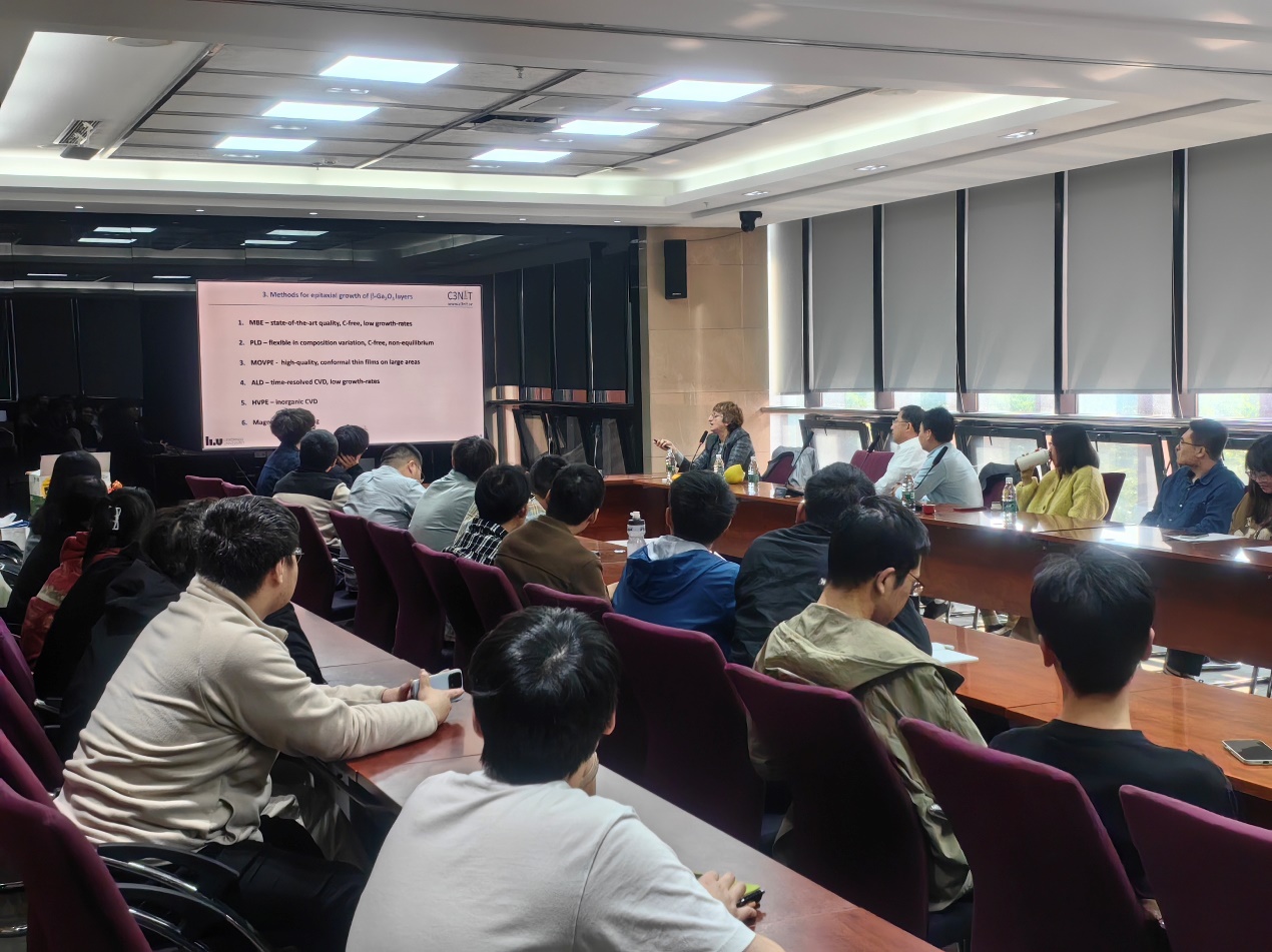 Gogova教授从超宽禁带半导体氧化镓的材料优势、应用前景出发,为大家剖析了近年来氧化镓成为世界性研究热点的原因;并基于自己的研究成果,介绍了其首创的Hot-wall MOCVD技术,分享了该技术在制备高质量氧化镓同质/异质外延材料方面的先进性。学术报告过程中, Gogova教授与参会的老师和同学进行了热烈讨论。随后,IC-GAO课题组的博士研究生以学术报告的形式展示了自己的研究进展,Gogova教授对各位博士生的研究工作进行了点评并高度称赞其研究的重要性。