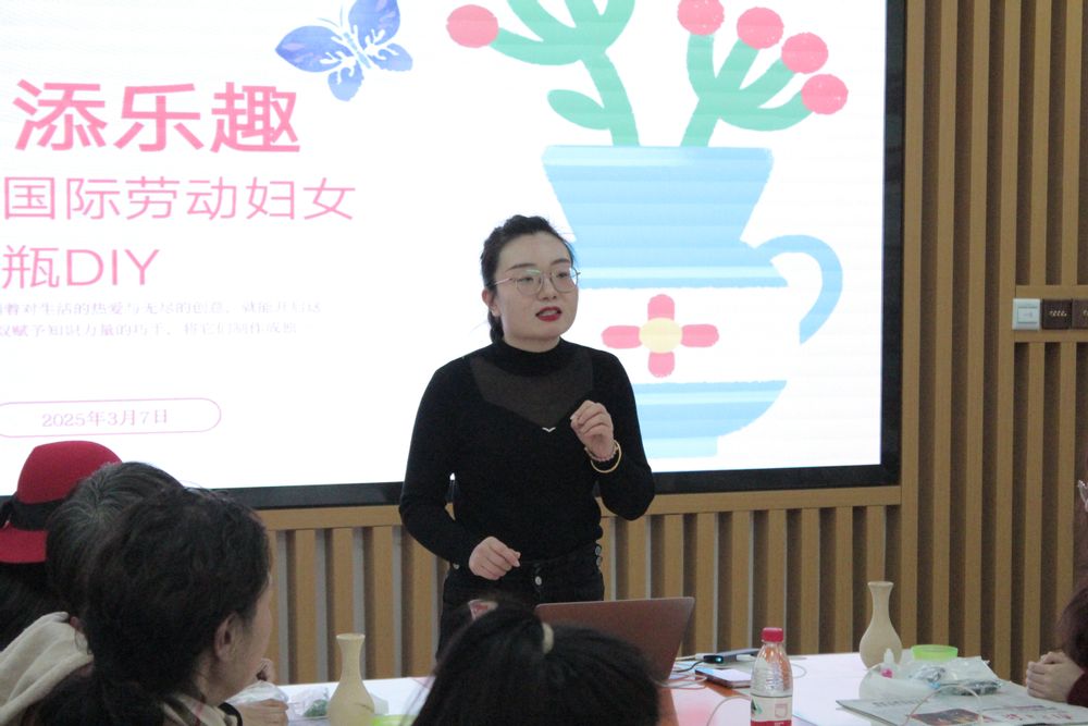 活动伊始,幸运轮盘 工会主席肖俊桂代表幸运轮盘 向全体参会女教职工以及女学生代表致以节日的祝福。随后,肖主席为大家带来了一场生动的花瓶DIY教学。从色彩搭配到材料运用,细致入微地讲解激发了大家的创作灵感。