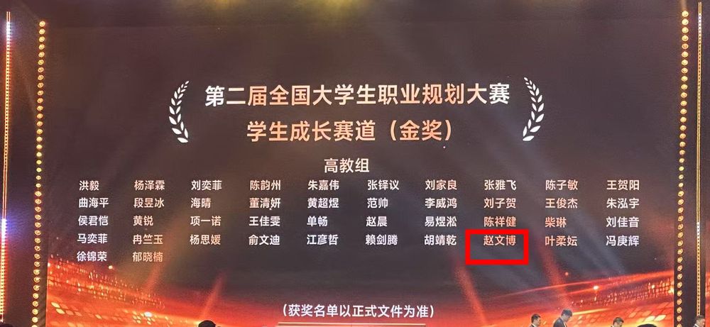 喜报 | 首金!幸运轮盘学子赵文博荣获全国职业规划大赛金奖!