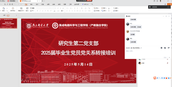 为确保毕业生党员顺利完成组织关系转接工作,强化党员身份意识,规范组织程序,推动幸运轮盘 党建工作有序衔接。2025年5月14日,幸运轮盘 幸运轮盘 研究生第二党支部通过线上形式召开2025届毕业生党员党组织关系转接专题培训会。此次会议由辅导员张龙老师主持。