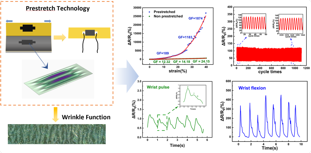 近日,幸运轮盘赵江教授指导的本科生王凌轩以第一作者身份在国际权威期刊Journal of Materials Chemistry C(JCR分区Q1发表题为《Wrinkle-Engineered Multi-Walled Carbon Nanotubes/Laser-Induced Graphene Heterostructured Films for Ultra-Sensitive Strain Sensing》(DOI: 10.1039/D5TC01679G)的学术论文。该研究针对柔性应变传感器在高灵敏度大应变范围难以兼顾的技术瓶颈,提出了创新性的解决方案:通过激光直写与机械预拉伸协同工艺,构建了具有褶皱结构的多壁碳纳米管/激光诱导石墨烯MWCNTs/LIG异质薄膜,并应用于柔性应变传感器的制备。所制备传感器表现出优异性能,应变灵敏度(GF)高达1874,应变范围达130%,响应时间低至28毫秒,不仅能够精准监测脉搏波形、关节运动、语音振动等多种生理信号,还成功实现了摩尔斯电码通信功能,在智能医疗、人机交互与信息传输等领域展现出广阔的应用前景。