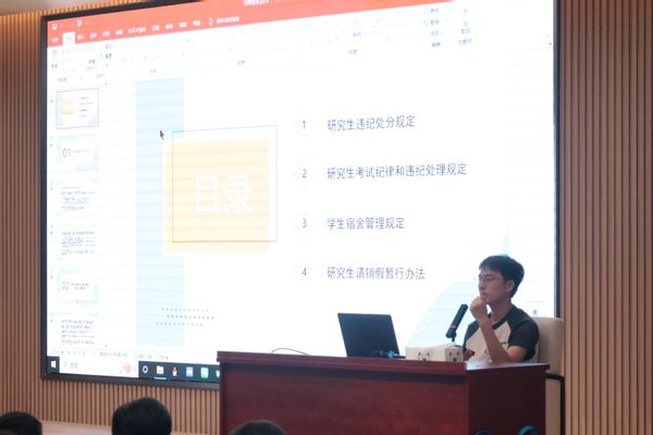 随后张龙老师逐一讲解了研究生违纪处分规定、研究生考试纪律和违纪处理规定等相关规定,结合典型案例强调学术诚信与考试纪律的重要性。在宿舍管理方面,他详细说明调换宿舍、退宿、校外住宿等流程的规范性,明确卫生标准及水电费缴纳要求,着重强调严禁在宿舍内、楼道、教研室等公共场所抽烟的硬性规定。针对请销假制度,他明确指出 “外出不归宿需提交请假条,经导师与辅导员双重签字同意的要求,提醒新生强化规则意识。