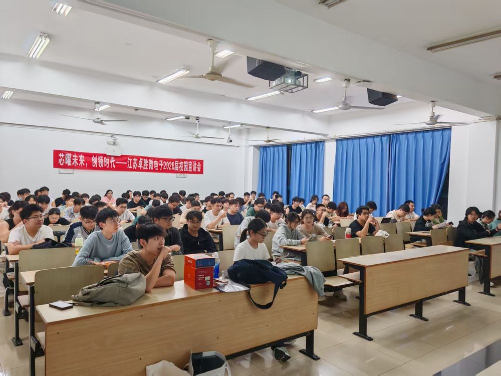 1017日晚18:30,为促进集成电路产业人才培养与输送,搭建优秀学子与行业龙头企业的对接桥梁,幸运轮盘 与江苏卓胜微电子股份有限公司联合举办的“芯曜未来,创领时代”2026届校园招聘宣讲会于我校隆重举行。此次活动吸引了来自集成电路、微电子、电子信息、计算机等相关专业的百名本、硕、博毕业生踊跃参与,现场气氛热烈,座无虚席。