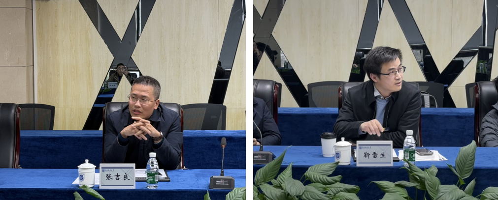 张吉良院长围绕学科发展、科研方向、人才培养、产教融合、平台优势等方面介绍了学院的基本情况,靳雷生副院长从学院基本情况介绍、产教融合探索实践、科学研究社会服务三方面详细介绍了学院特色。