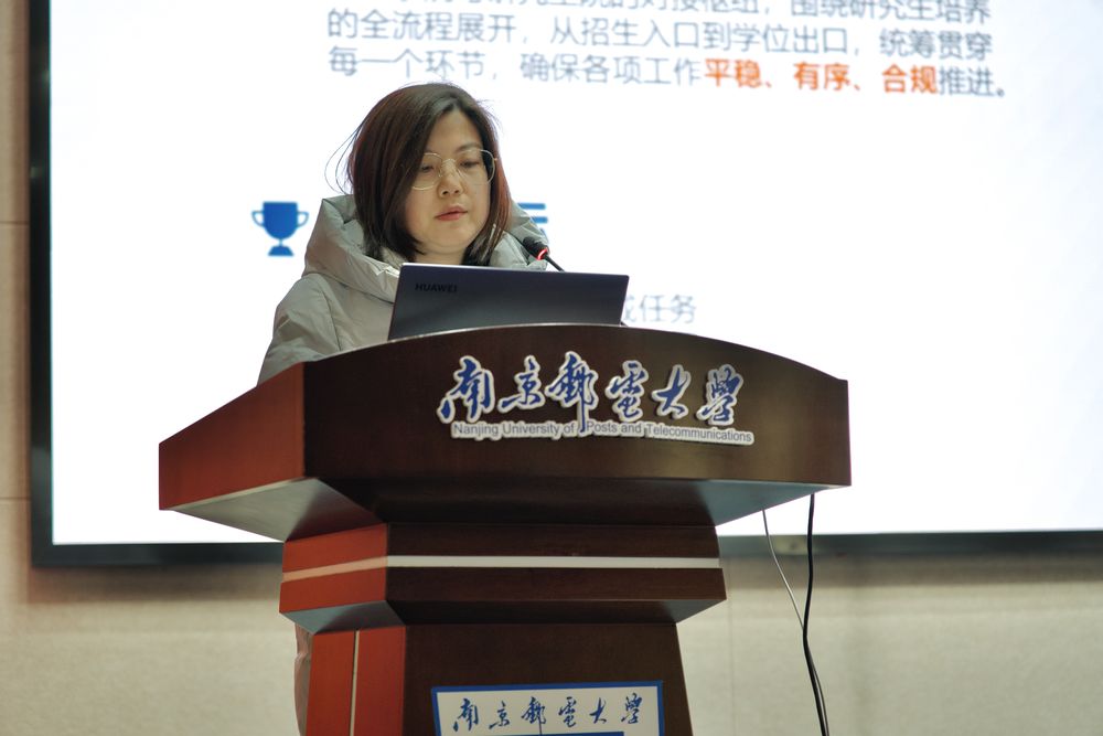 肖俊桂副书记从铸魂育人、固本强基、拓新赋能、自我革命四点出发,深入总结了学工线全年工作和取得的优秀成绩,她指出,来年耕耘不止,逐光而行,旨在提升队伍专业素养与担当精神。