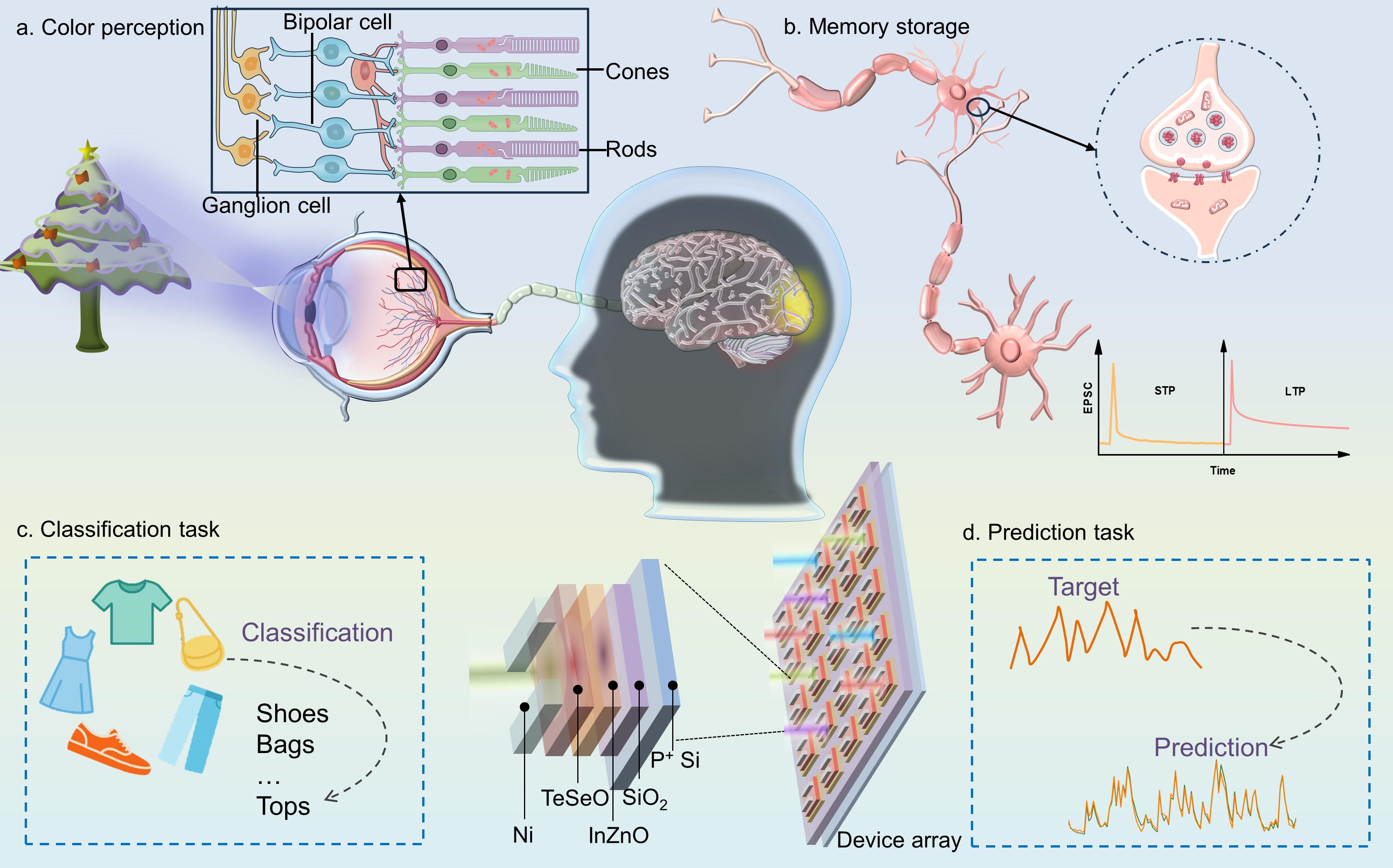 1 人类视觉感知系统示意图与多光谱感知TeSeO/InZnO光电突触储备池计算。